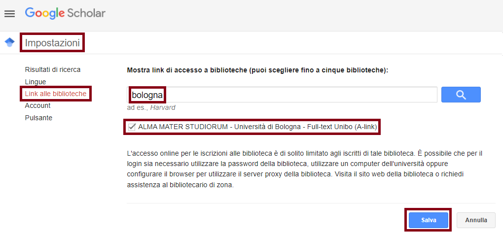 A-link: impostazioni Google Scholar